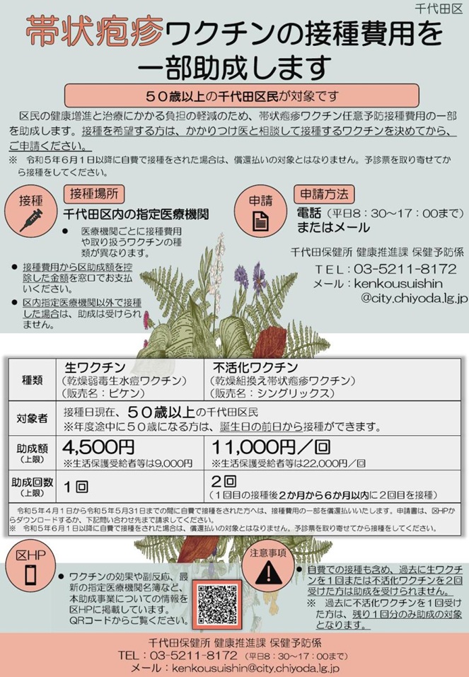 千代田区のホームページをご覧になられ、接種を希望される方は、2種類のワクチン(シングリックス・水痘ワクチン)から1つを選んで千代田保健所に電話またはメールで予診票をお取り寄せください。その後に当院まで予約の電話をお願いいたします。なおワクチン接種の可否、種類などについては院長までご相談ください