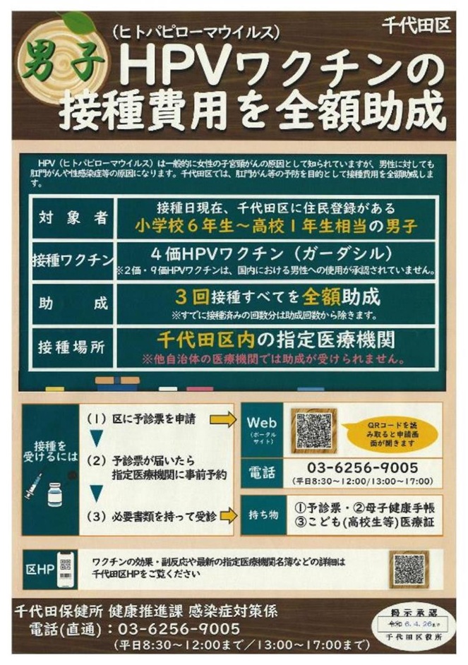 子宮頸がんの原因となる「ヒトパピローマウイルス(HPV)」は肛門がん、尖圭コンジローマなどの原因のひとつとなります。千代田区内に住民登録がある男子を対象に予防接種を実施しています
